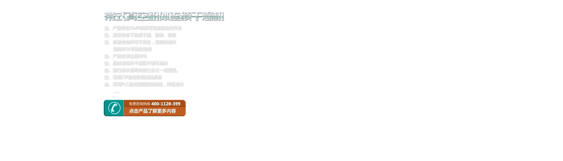 該機為提醇的高濃度、高粘度的中藥浸膏解決了一大難題,以往采用離心噴霧,因為溫度,熱敏性成份遭破壞、易粘壁;采用真空烘箱因時間長、能耗高、易染菌、易返潮,無法連續生產,均達不到GMP質量標準。 本機克服上述存在的許多問題,即干燥溫度低,有效成分不流失,干燥時間短、能耗低、無污染,能連續生產。